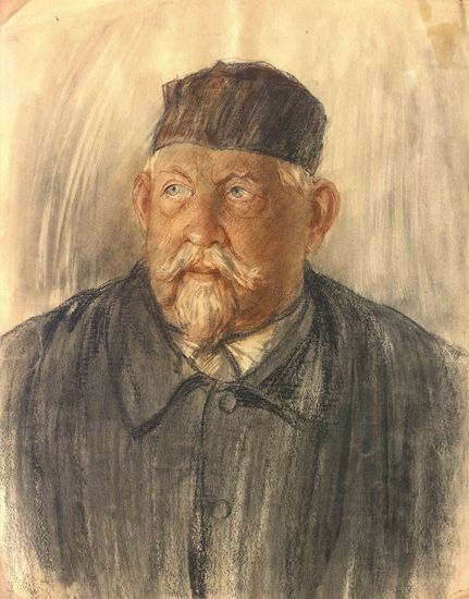 1943. Portrait of a man in skull-cap and black coat. Paper, coal, sanguine. 54x43
